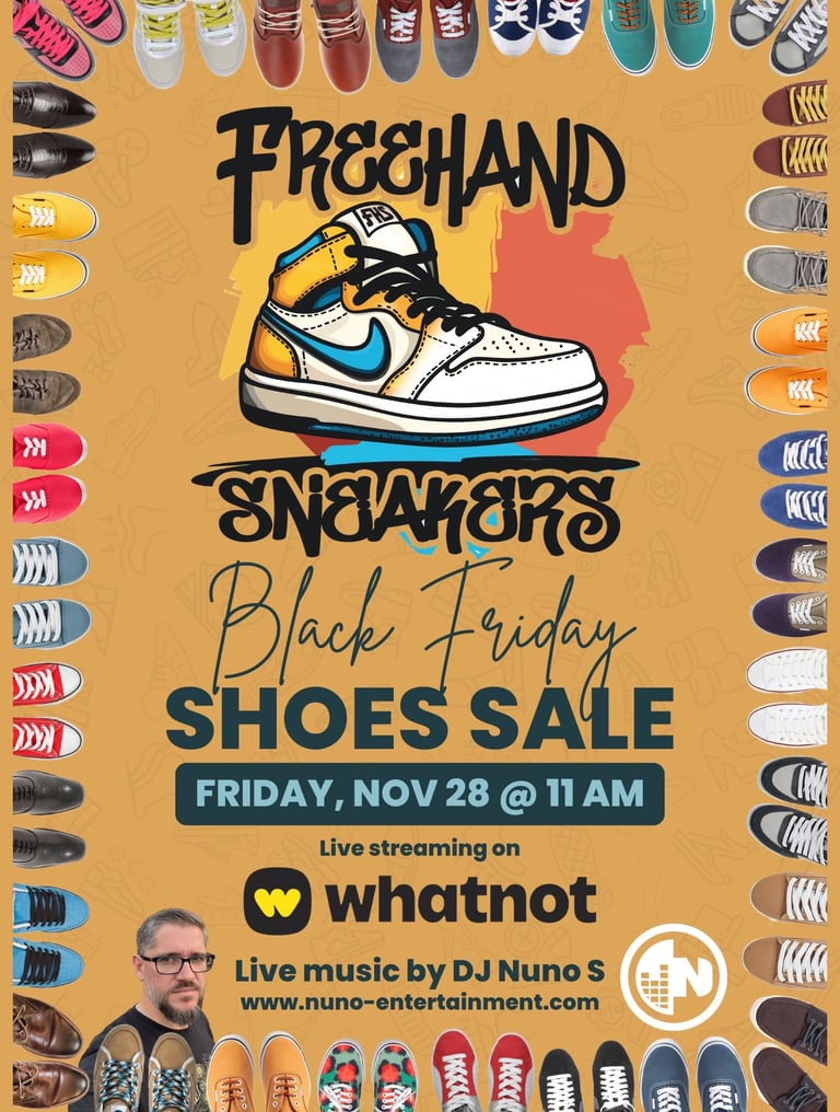 #BlackFriday #FreehandSneakers #NunoEntertainment #DJNunoS #SneakerSale #ShoeDeals #FreeShipping #NewKicks #Sneakerheads #BlackFridayDeals #ShopLocal #80s90s2000s #LiveDJ #HolidayShopping